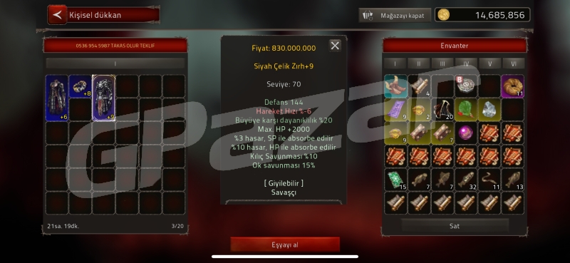 Gece 02:00 dan sonra sipariş verirseniz Türkiye saati ile 12:00 da teslim edilecektir. Bunu göz önünde bulundurmanız önemle rica olunur.+9 Siyah Çelik 2000 Hp 15 Ok %10 Hp Absorbe 10 Kılıç Full 4 Taşlı Koruma Hız Kurnazlık