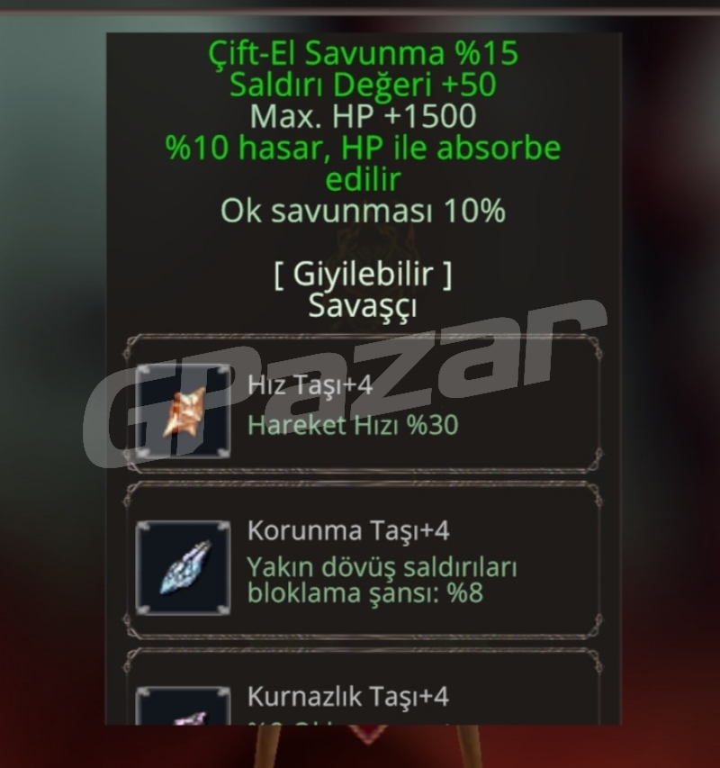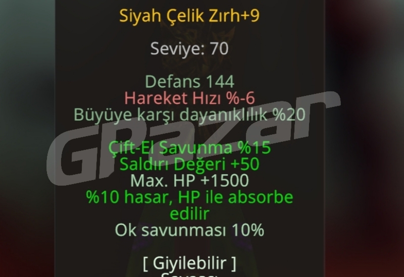 siyah çelik+9 /mhp 1500/str +50/çift el 15/ok 10/hp absorbe 10/+4 taşlı ,hız-korunma-kurnazlık