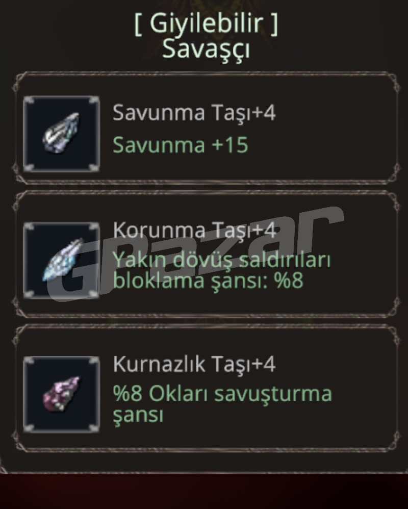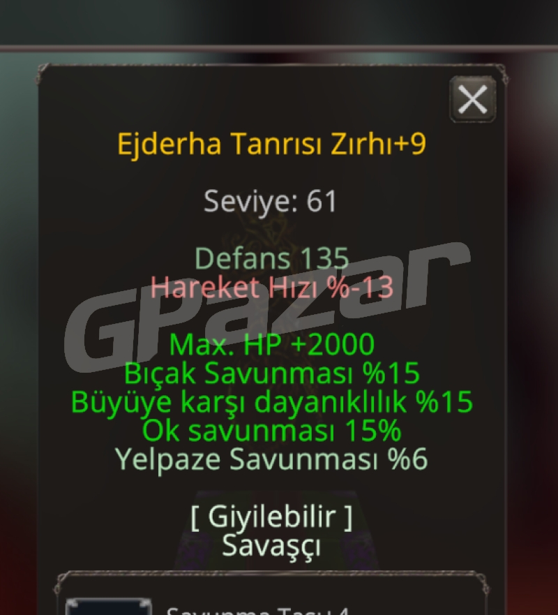 {+2000 HP OK SAVUNMASI BÜYÜYE KARŞI DAYANIKLILIK BIÇAK SAVUNMASI %6YELPAZE SAVUNMASI} TAŞLARIN HEPSİ +4 EFSUNLARIN 4Ü TAM ORAN, KAÇMAZ ZIRH. ARTI 8 SİYAH ÇELİK İLE AYNI DEĞERLERE(DEFANS VE BÜYÜ SAV) SAHİP VE HEM NİNJALARA KARŞI WSLERDE HEMDE KULE-SÜRGÜN GİBİ MAPLARDA AYRICA METİN FARMINDA DAHİ KULLANABİLECEĞİNİZ HARİKA BİR İTEM. BU FİYATA BU ELİTLİKTE BENZER BİR ÜRÜNÜ BULMAK MÜMKÜN DEĞİL. ALICISINA HAYIRLI OLSUN.